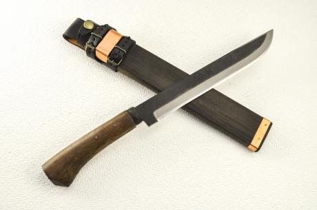 【■数量限定:1本特別販売■】 土佐鍛キャンプ鉈 110 土佐オリジナル白鋼 両刃 黒槌目 黒鉄ツバ輪木鞘オイルステン胡桃【晶之作】【訳有/展示会展示品:傷有 ノークレームノーリターン:承諾の上注文】