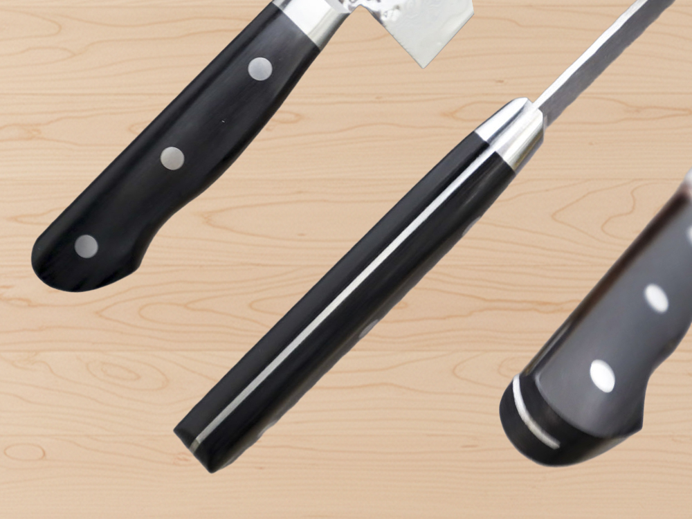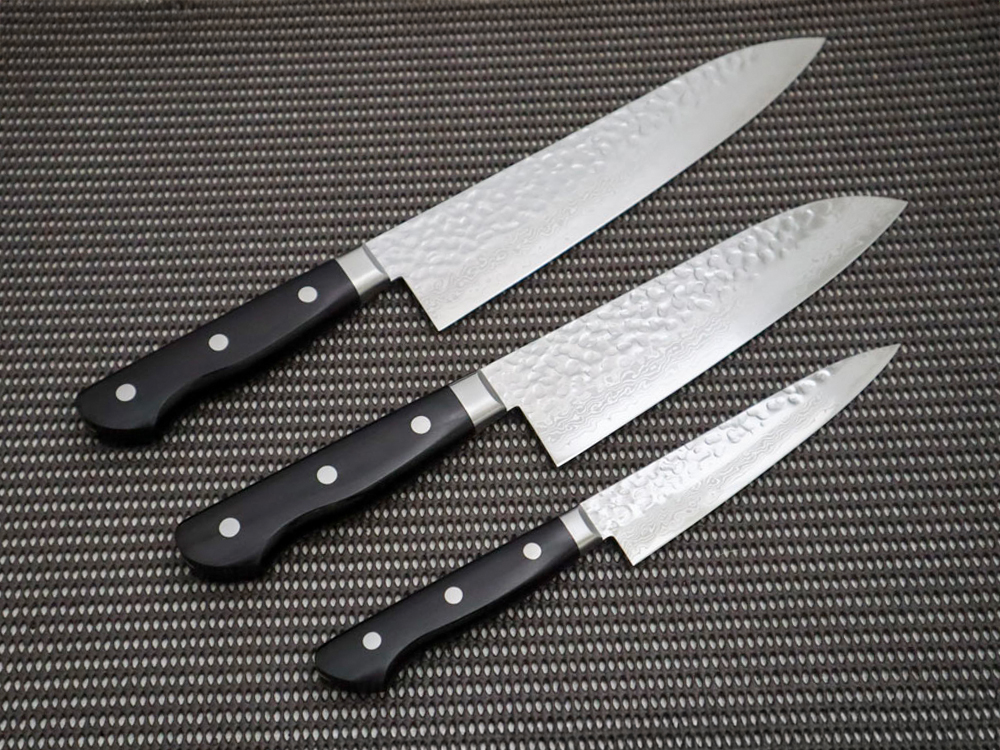 三徳/ペティ/牛刀ダマスカス15層包丁槌目磨:黒合板 |