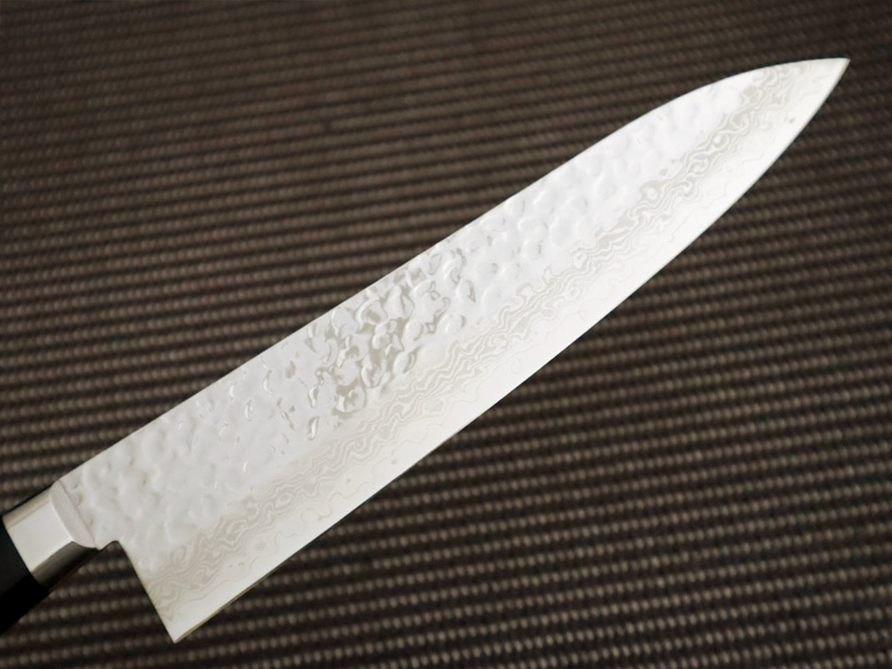 刃芯にVG10を使用し、両側を7層ステンレスで挟んだ本割込ダマスカス鋼。錆びにくく研ぎやすい上、鋭い切れ味と長切れを実現。 積層模様の美しさも魅力です。。 |