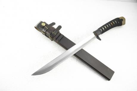 ベース商品 【戦国高級鉈】003 高級剣鉈【西陣柄巻ウレタン拵鞘】 300 白鋼 両刃 磨 黒ツバ輪 木鞘オイルステン(ウレタン)胡桃 柄巻(緑)西陣入