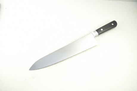 【洋包丁特集】005 【輸出商品】 牛刀(背厚)包丁 300 両刃 磨 黒合板 【源實光作】 【訳有/海外展示会展示品:傷有 ノークレームノーリターン:承諾の上注文】