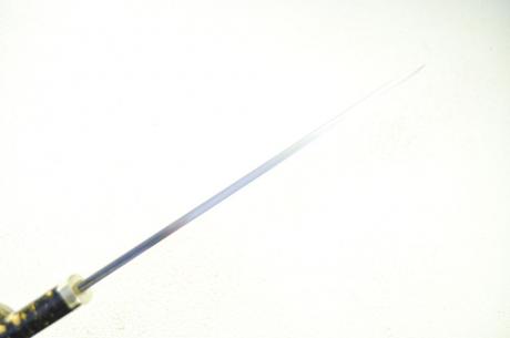 | 厚mm/鋼/柄/輪/重g | 5.7/土佐オリジナル白鋼/漆朴木チェッカー (黒金チラシ)/ニッケルシルバー W/360 |
