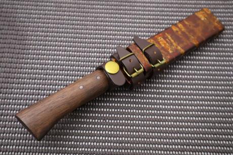 【ダマスカス特集】003 土佐副剣鉈 120 DM31青2 黒槌目 黒丸輪 桜巻(木鞘) 洋樫オイルステン 【晶之作】