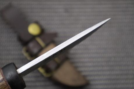 | 表面仕上/血溝/鞘/鞘備考 | 黒槌目/ヒなし/木鞘オイルステン/牛皮バンドチョコ色 |