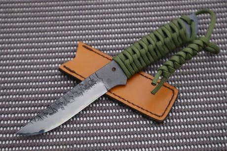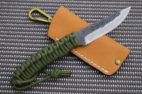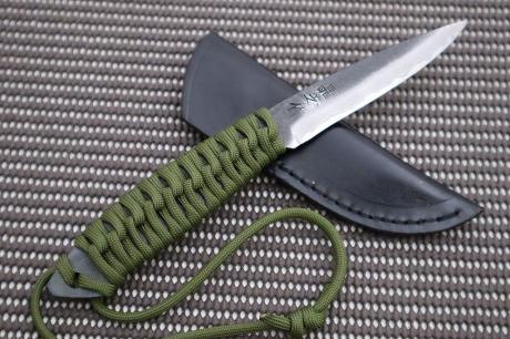 【ダマスカス特集】001フルタングマテェット緑パラコード巻 155 DM15青2 黒槌目 木鞘銅板オイルステン フルタング緑パラシュートコード巻 【晶之作】