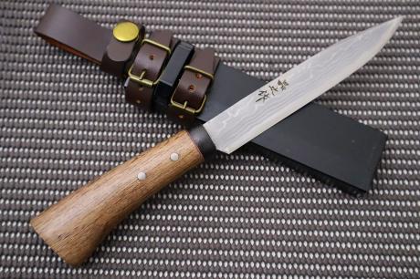 【ダマスカス特集】007土佐副剣鉈 100 DM31青2 黒槌目 黒丸輪 茶皮ケース 洋樫オイルステン 【晶之作】