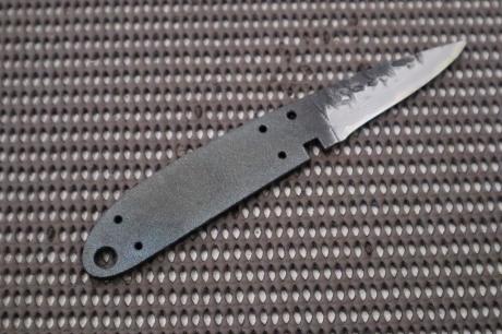 【ダマスカス15青2鍛造小刀両刃特集】001 ダマスカス小刀52DM15青2 黒槌目フルタング【晶之作】【訳有/展示会展示品:傷有 ノークレームノーリターン:承諾の上注文】