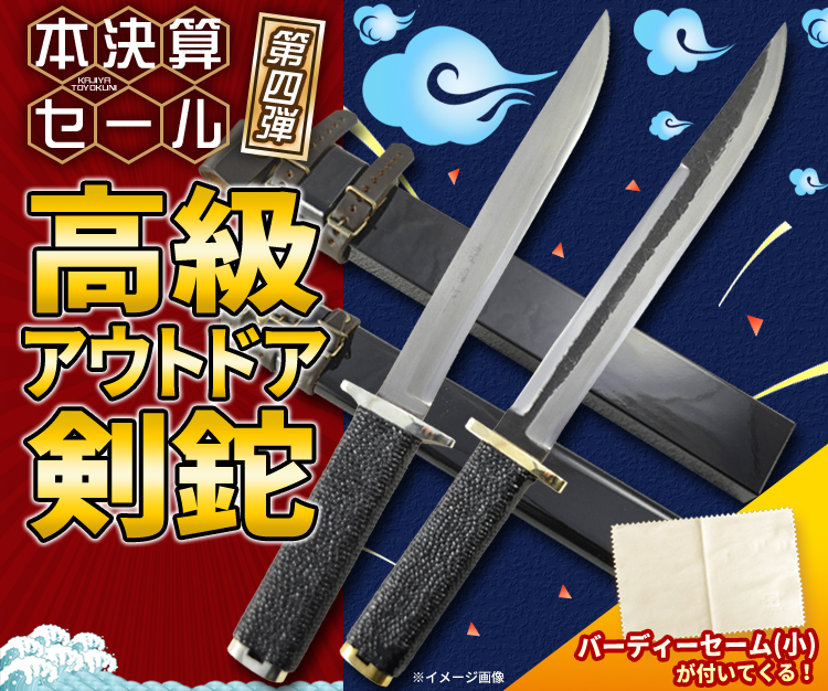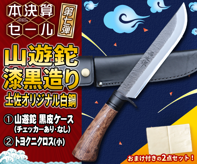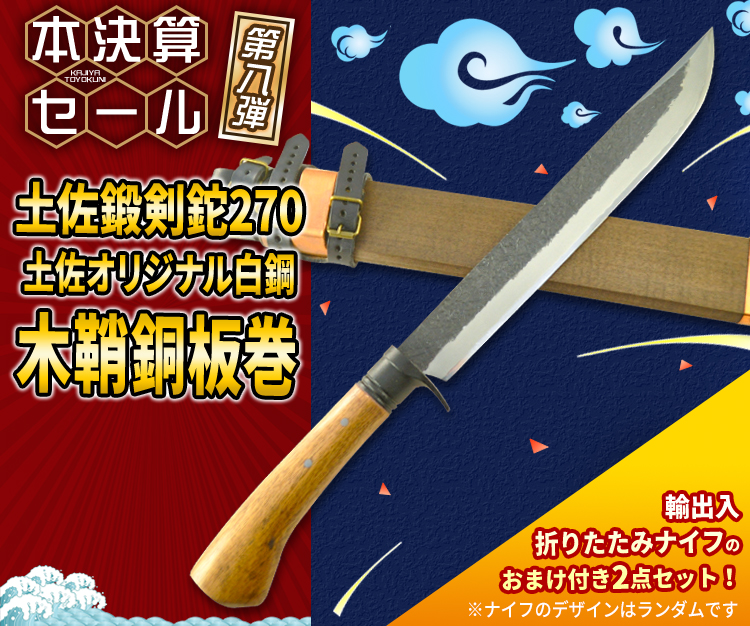 【狩猟応援セール】005 土佐鍛 狩猟剣鉈270 (4.7mm厚) 白鋼 両刃 黒槌目 黒ツバ 木鞘銅板オイルステン皮バンド 洋樫オイルステン+折りたたみ輸出入ナイフ 【訳有/展示会展示品:傷有 ノークレームノーリターン:承諾の上注文】