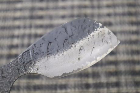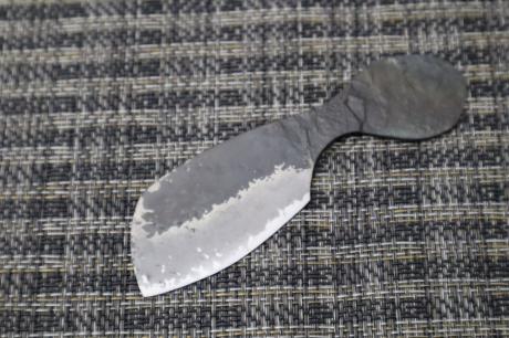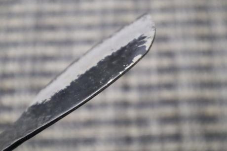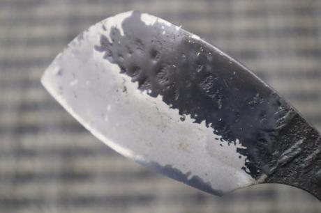 トップページ【鍛造小刀特集】 > 【鍛造小刀特集】012 鍛造小刀 55 白鋼 両刃 黒槌目 【晶之作】 【訳有/展示会展示品:傷有 ノークレームノーリターン:承諾の上注文】