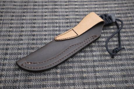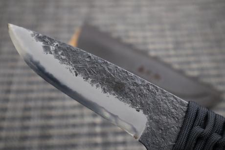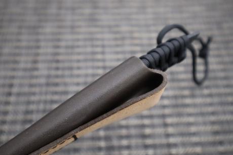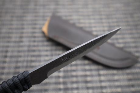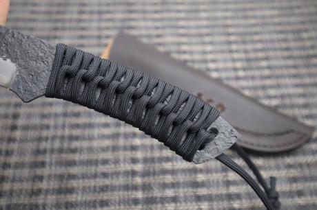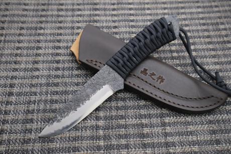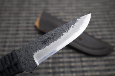 【フルタングアウトドア特集】 > 【フルタングアウトドア特集】003 黒両刃・パラコード巻き作業刀95 白鋼 両刃 黒槌目 フルタング チョコ皮ケース 黒パラシュートコード 【晶之作】 【訳有/展示会展示品:傷有 ノークレームノーリターン:承諾の上注文】