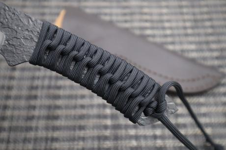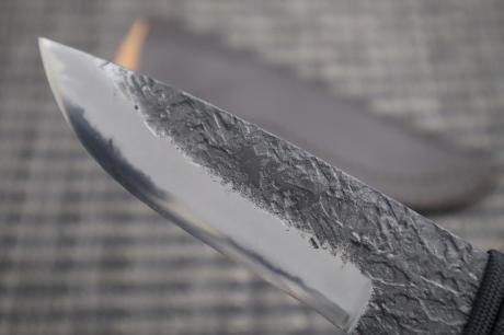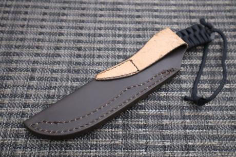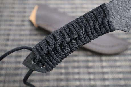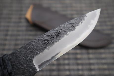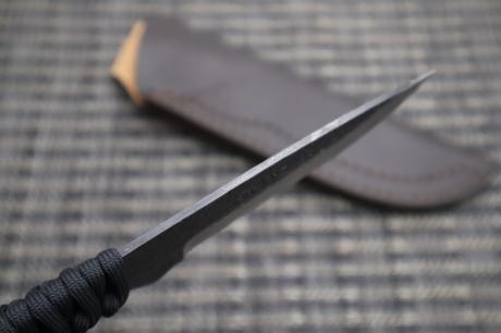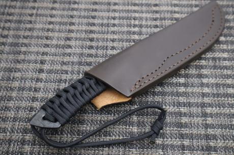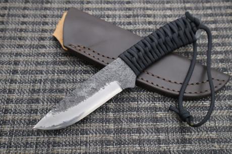 【フルタングアウトドア特集】 > 【フルタングアウトドア特集】004 黒両刃・パラコード巻き作業刀95 白鋼 両刃 黒槌目 フルタング チョコ皮ケース 黒パラシュートコード 【晶之作】 【訳有/展示会展示品:傷有 ノークレームノーリターン:承諾の上注文】