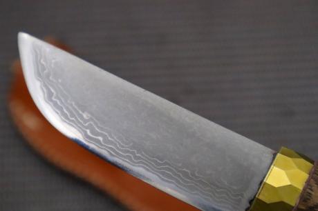 トップページ【野遊び極め万能ダマスカス鉈 > 【野遊び極め万能ダマスカス鉈】003 剣鉈 80 DM15青2 両刃 全曇 真鍮丸輪  茶皮ケース 洋樫オイルステン 【晶之作】 【訳有/展示会展示品:傷有 ノークレームノーリターン:承諾の上注文】