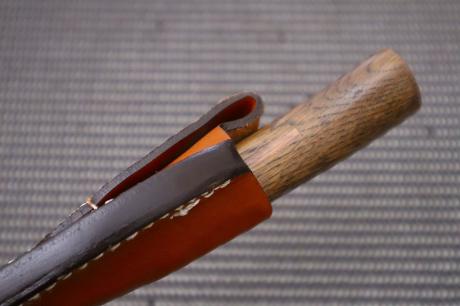 【野遊び極め万能ダマスカス鉈 > 【野遊び極め万能ダマスカス鉈】004 剣鉈 80 DM15青2 両刃 全曇 真鍮丸輪 茶皮ケース 洋樫オイルステン 【晶之作】 【訳有/展示会展示品:傷有 ノークレームノーリターン:承諾の上注文】
