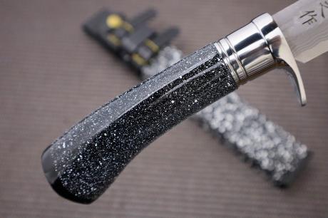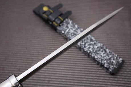 厚mm/鋼/柄/輪/重g5.9/DM15青2(7+青2+7)/漆拵洋樫柄 (黒白チラシ漆)/ステンツバ輪/350
