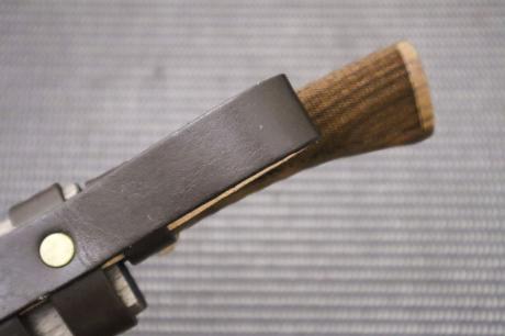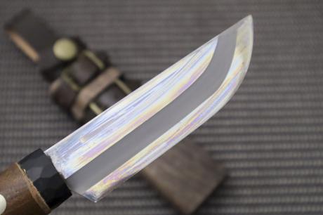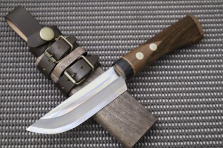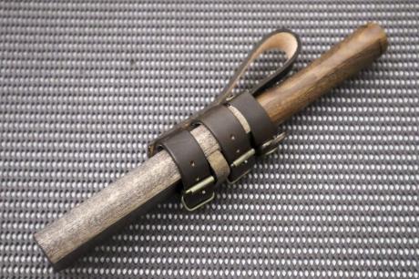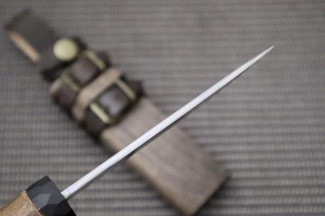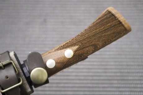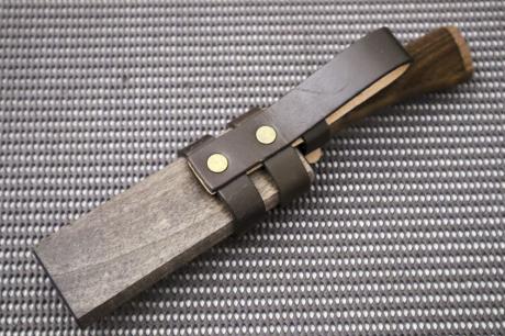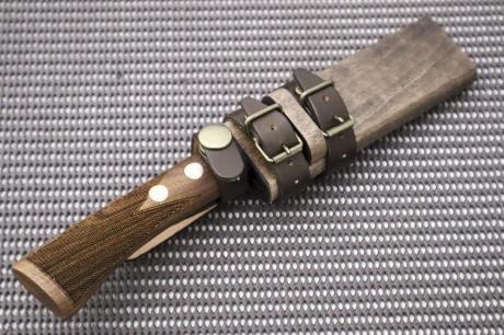 柄は衝撃に強い胡桃材にチェッカーウレタン加工、鞘は木鞘オイルステン仕上げ。
