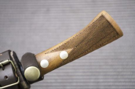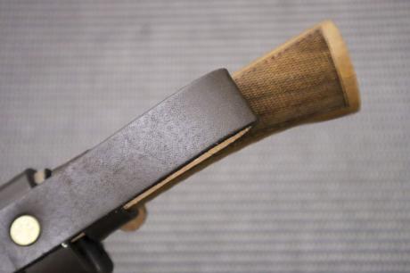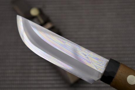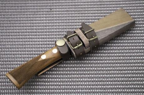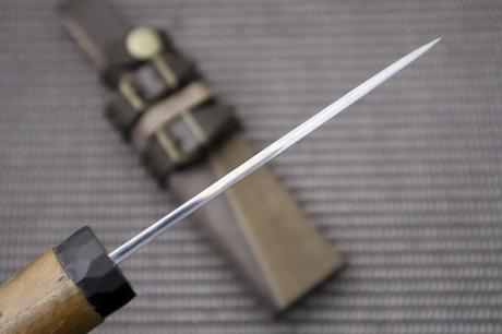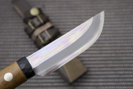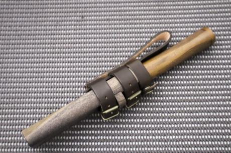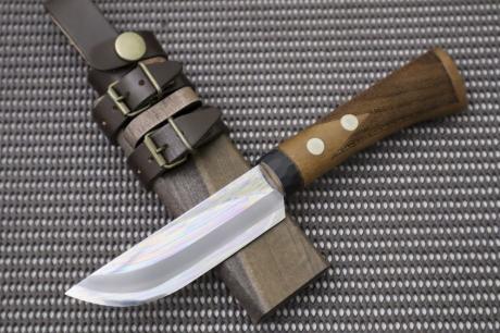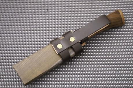 柄は衝撃に強い胡桃材にチェッカーウレタン加工、鞘は木鞘オイルステン仕上げ。