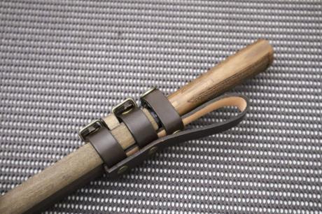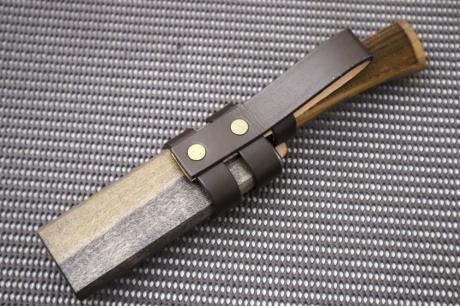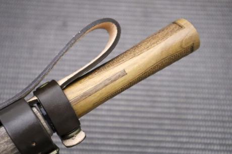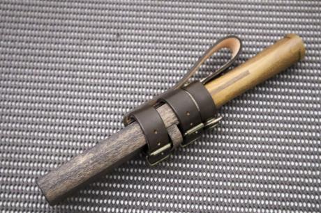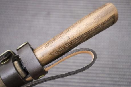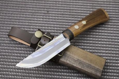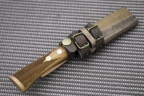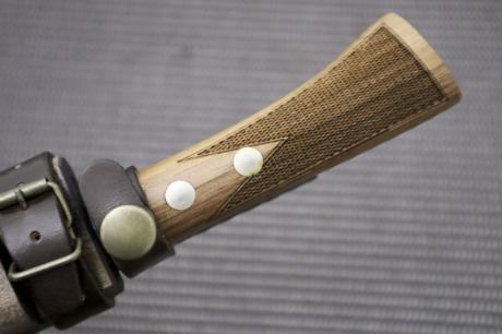 柄は衝撃に強い胡桃材にチェッカーウレタン加工、鞘は木鞘オイルステン仕上げ。