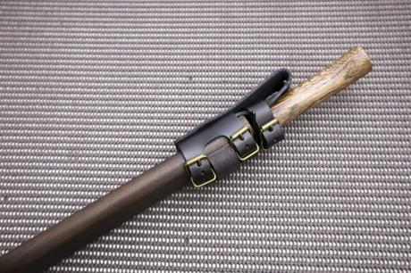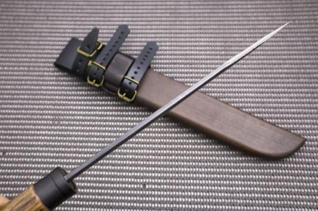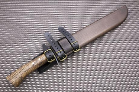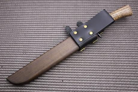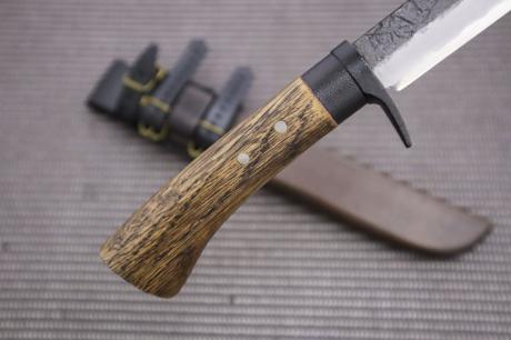 木鞘には牛革バンドを装備し、腰ベルトに装着できるため、野外作業や狩猟時の持ち運びも快適です。