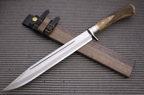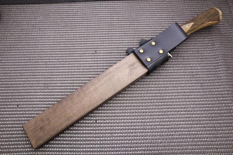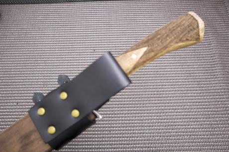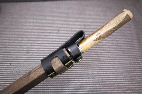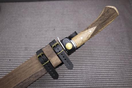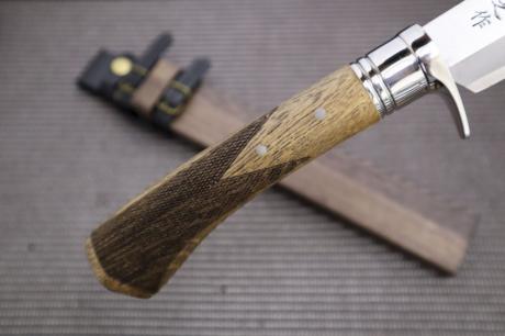 木鞘には牛革バンドを装備し、腰ベルトに装着できるため、野外作業や狩猟時の持ち運びも快適です。