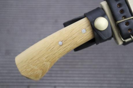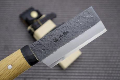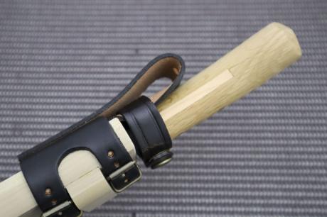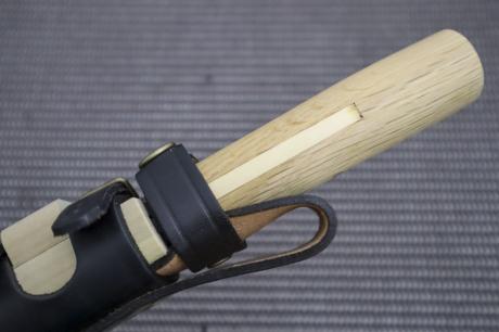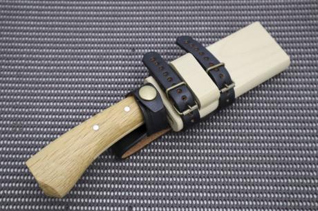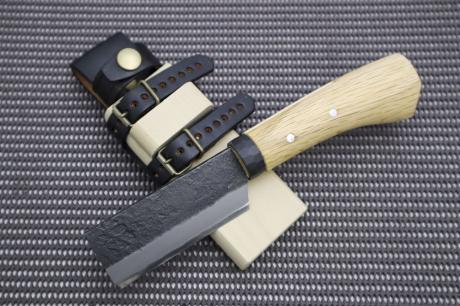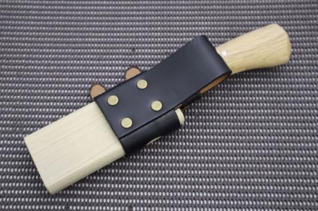 樫柄と黒槌目の仕上げ、ベルト装備可能な木鞘皮バンド付きで、プロの竹細工職人にも愛用される逸品です。