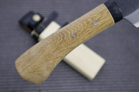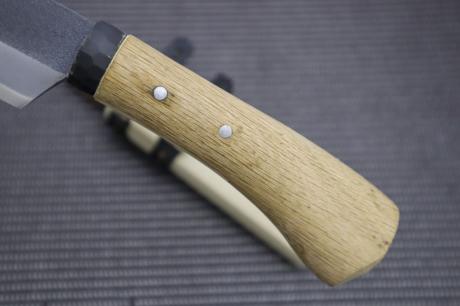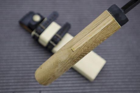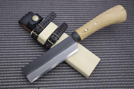 樫柄と黒槌目の仕上げ、ベルト装備可能な木鞘皮バンド付きで、プロの竹細工職人にも愛用される逸品です。