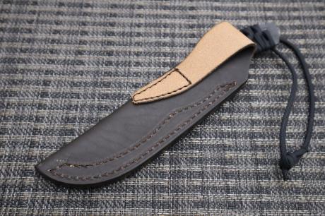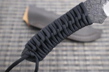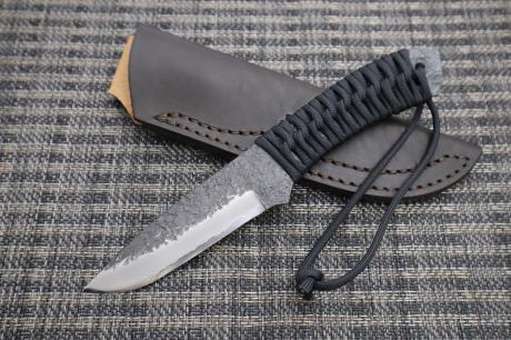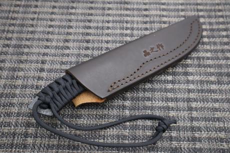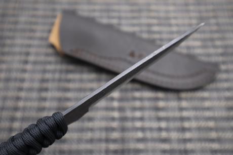 【フルタングアウトドア特集】 > 【フルタングアウトドア特集】005 黒両刃・パラコード巻き作業刀95 白鋼 両刃 黒槌目 フルタング チョコ皮ケース 黒パラシュートコード 【晶之作】 【訳有/展示会展示品:傷有 ノークレームノーリターン:承諾の上注文】